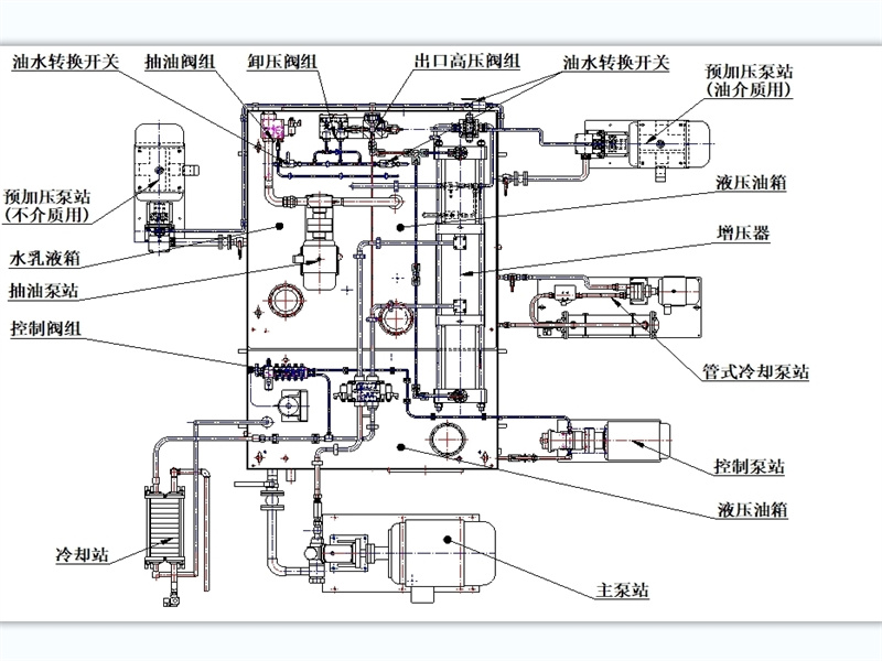 液壓系統(tǒng)由增壓系統(tǒng)、驅(qū)動(dòng)系統(tǒng)和充液站組成。主要功能是為承壓容器和執(zhí)行機(jī)構(gòu)提供壓力源,充液站實(shí)現(xiàn)快速向水油隔離桶內(nèi)加水和抽水。